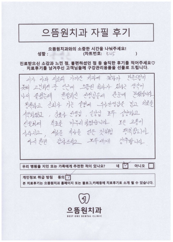 페이지 정보 작성자 최고관리자 댓글 0건 조회 485회 작성일 23-12-18 10:36 목록 후기 본문 이가 아파 괴로워 가까운 치과에 갔다가 만족스럽지 못해 고민하던 중 인근에 으뜸원 치과가 있다는 생각이 나서 들렀는데 친절하신 선생님들에 한눈에 반했습니다. 목록목록 이전글후기 24.01.04 다음글후기 23.12.18 댓글 0 댓글목록 등록된 댓글이 없습니다.