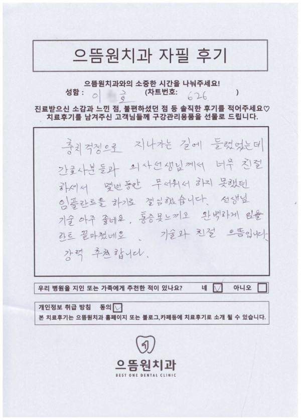 충지걱정으로 지나가는 길에 들렸었는데 간호사분들과 의사선생님께서 너무 친절하셔서 몇년 동안 무서워서 하지 못했던 임프란트를 하기로 결심했습니다.