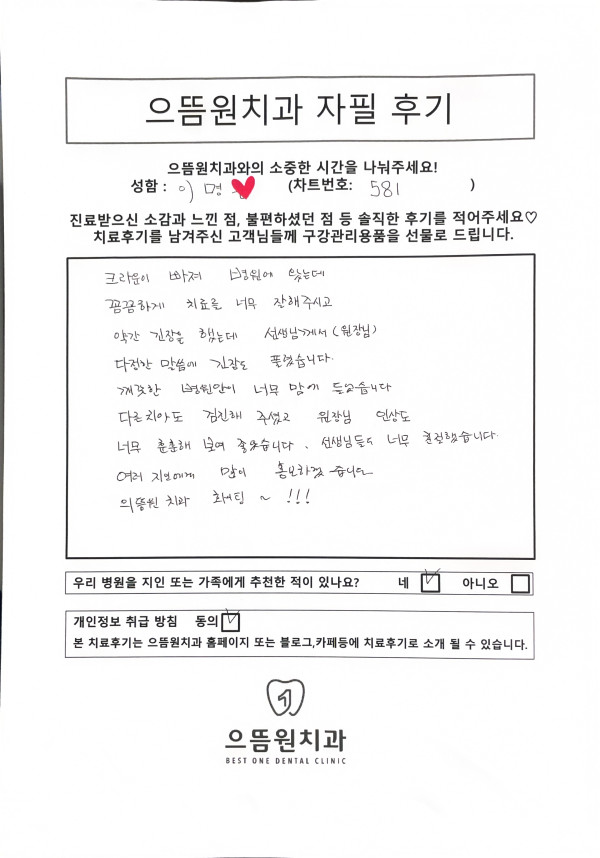 여러 지인에게 많이 홍보하겠습니다. 으뜸원치과 화이팅~!!!