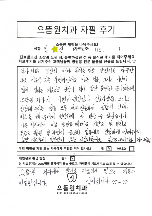 다른 치과에서 치료 받았을 때보다도 시간도 덜 걸리고 통증도 훨씬 덜 하면서 궁금한 질문에도 친절하게 알려주셔서 항상 치료 후 만족감이 드는 시간이었어요, 앞으로 우리가족 치과치료 으뜸원 치과에서 받기로 다짐하게 만드는 기술과 친절함입니다. 감사합니다~