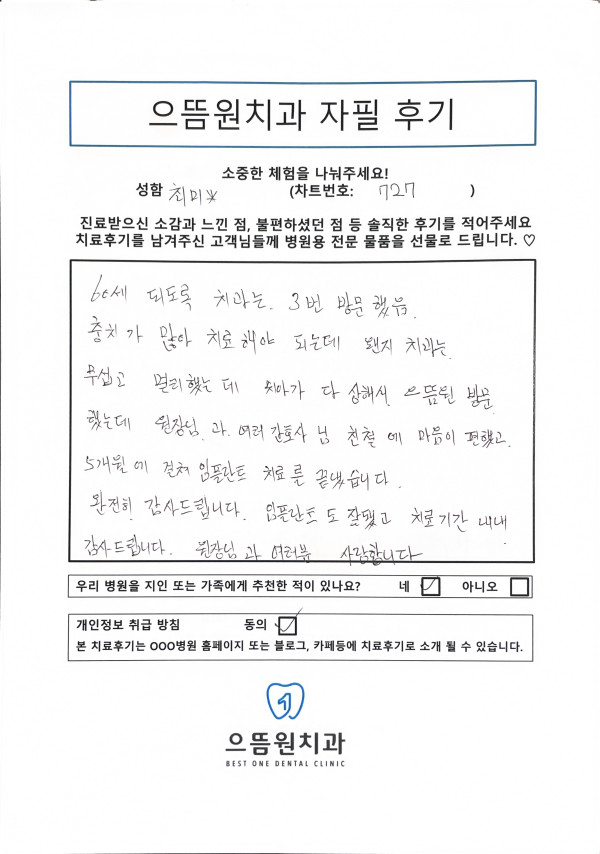 충치가 많아 치료해야 되는데 왠지 치과는 무섭고 멀리했는데 치아가 다 상해서 으뜸원 방문 했는데 원장님과 여러 간호사님 친절에 마음이 편했고, 5개월에 걸쳐 임플란트 치료를 끝냈습니다.