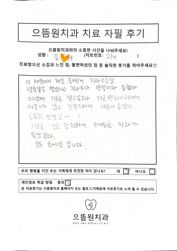 이 세상에 제일 무서운게 치과오는 일 병원 앞을 몇 번이고 지나가다 망설이다 들렸다 2년째 치료를 받고있으나 다른 병원에 비해서 아프지가 않고 친절하셔서 마음에 들었다(특히 선생님)